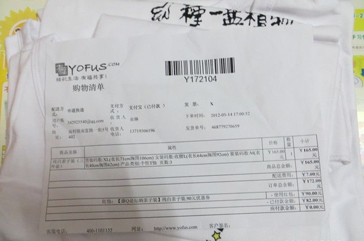有福网DIY的个性T恤亲子装14号下午5点下的单,15号就收到短信说已经发货。然后以为同城最多隔天就可以收到了,但最后18号下午6点才收到。申通的快递有够慢的,其他快递同城一般都是24小时内可以收到货的,搞不懂申通为什么就要三天时间才送到。