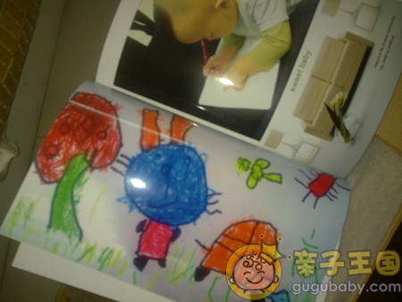 在杂志照片制作时,我还发现可以拿来发表宝宝的作品,这比一张一张保存宝宝作品省事多了,绝对是宝宝的真迹啊,咱来个有图又真相。。。。看见没,绝对是宝宝在旁边自己动手画的,但是好像笔不是水彩笔,呵呵~