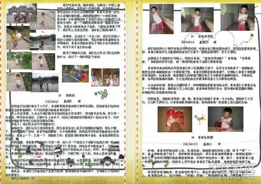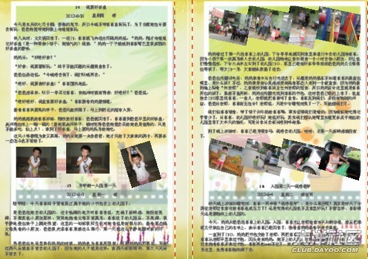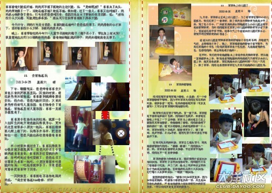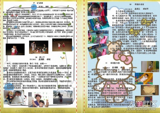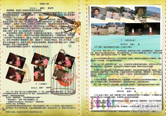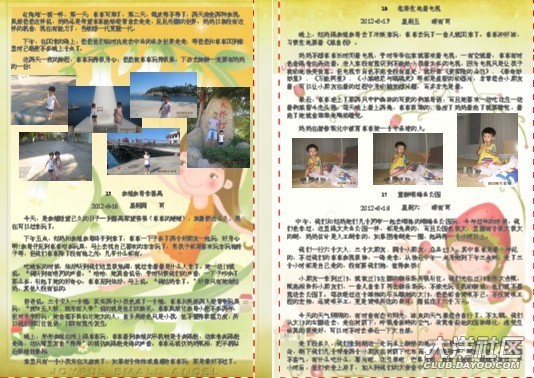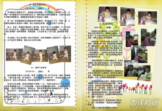 一开始做时,妈妈几乎是一页一篇日记,在做了10页后,妈妈发现其实可以把内容安排得更紧密些,只要把相片弄小一些,那样就可以放更多的日记进去。这时另外一个想法跃入脑海里,不如找些可爱的图片做背景。可是要找到好看的图片并不容易,妈妈花了很多时间去找图片。