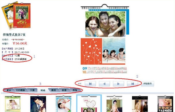 进入之后,可以看到此类挂历的介绍,1区域包括装订方式以及纸张,原来我做过印刷所以我知道250G铜版纸可是相当厚的哟。