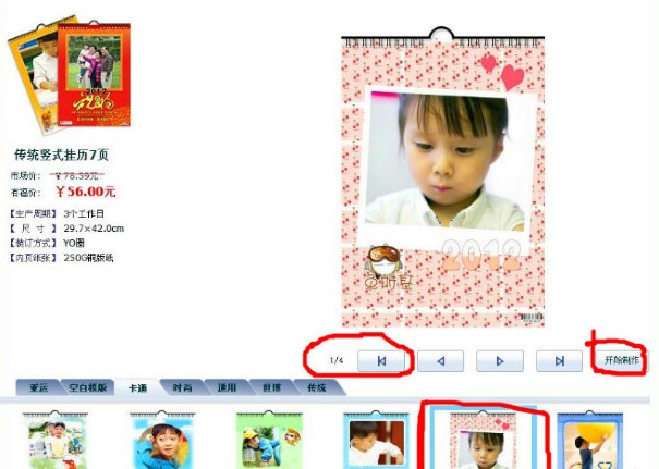 选择竖式挂历后预览只会显示4页,不是说7页么?先别着急,点击开始制作后就会变成7页啦!这时候就会导入事先选好的相片,根据你选的模式自动导入相对应照片数量,这样很省时间也很方便,所以妈妈们在选相片的时候最好把精华的都选出来了!